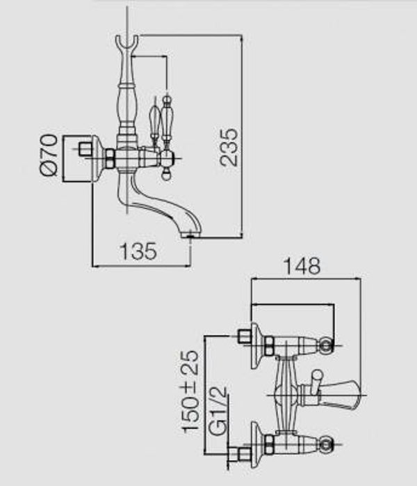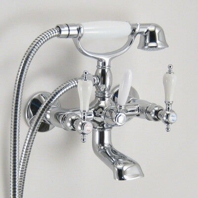 Bath faucet Nice Borgo Vecchio Leva • Classic style • Fixed spout, no aerator • Valve control • Handle material ceramic • Ceramic faucet axles Scope of delivery: Mixer, shower head, 150 cm hose, eccentrics, reflectors